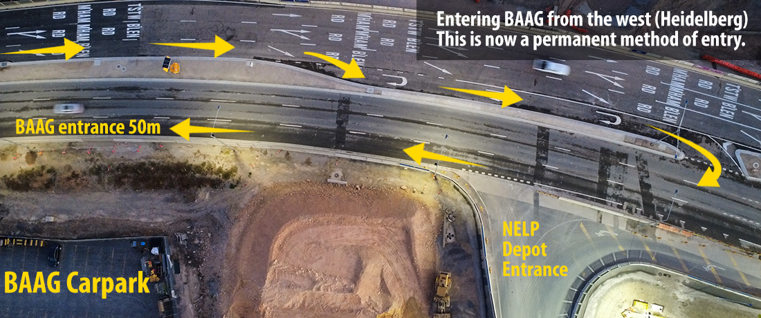 | Exiting BAAG ALL traffic leaving BAAG now must leave via the western driveway and head to the west (left). There is no longer a U-Turn facility outside BAAG. For traffic heading east you will need to head west and make a U-Turn further up the road; or alternatively continue further to the traffic lights at Dora Street or Lower Heidelberg Road. |